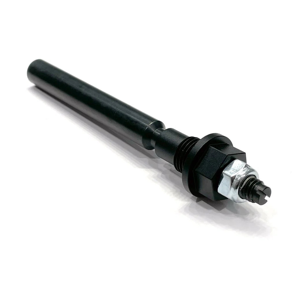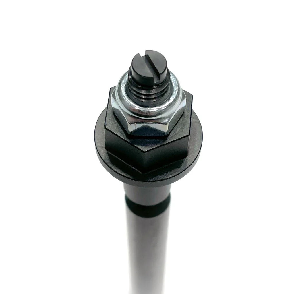 - Install the black fitting onto the bottom of the shaft with the nut facing down towards the small end, rotate this on as far as it will go to where the small end of the shaft sticks out the furthest. This would be the loosest setting once installed.